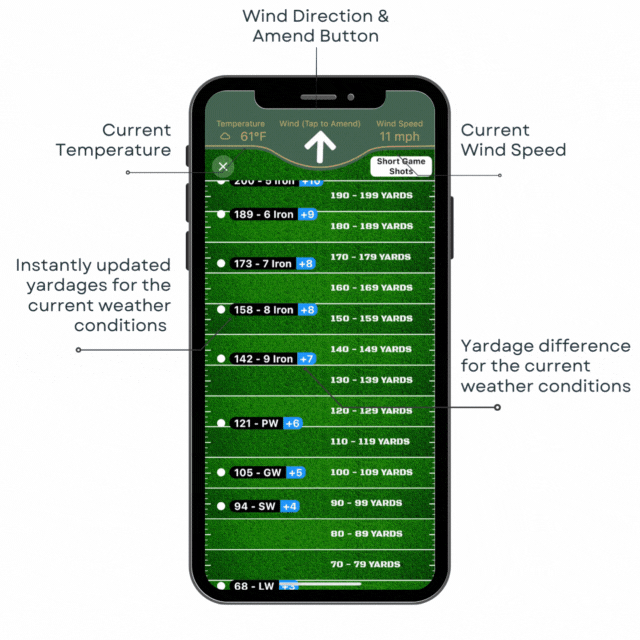 The app retrieves the latest weather forcast from your current location then grabs your entered yardages and makes calculations based on the current weather conditions and displays your new yardages. These new yardages are automatically updated as you move around the course and face differing targets, pins or greens.