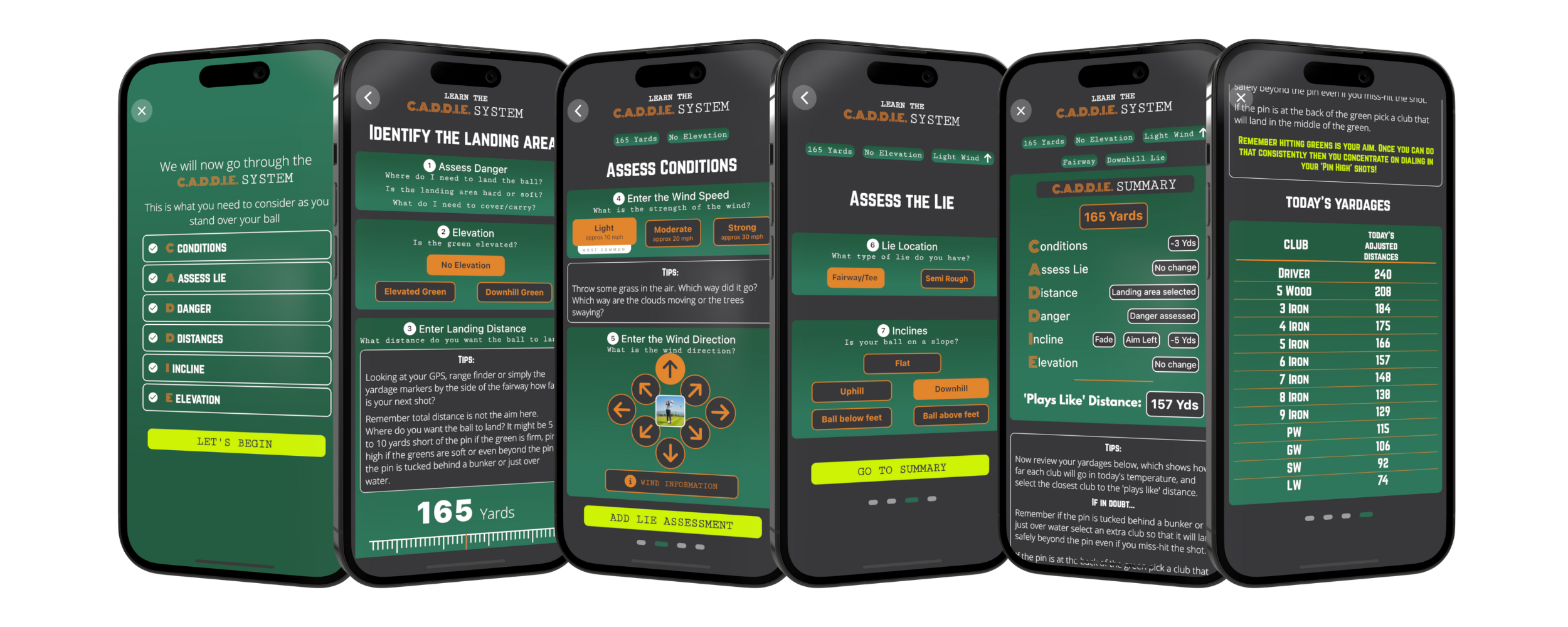 We understand that everyone has their own unique learning style, and we've taken that into account by creating three separate screens dedicated to demonstrating club selection techniques.