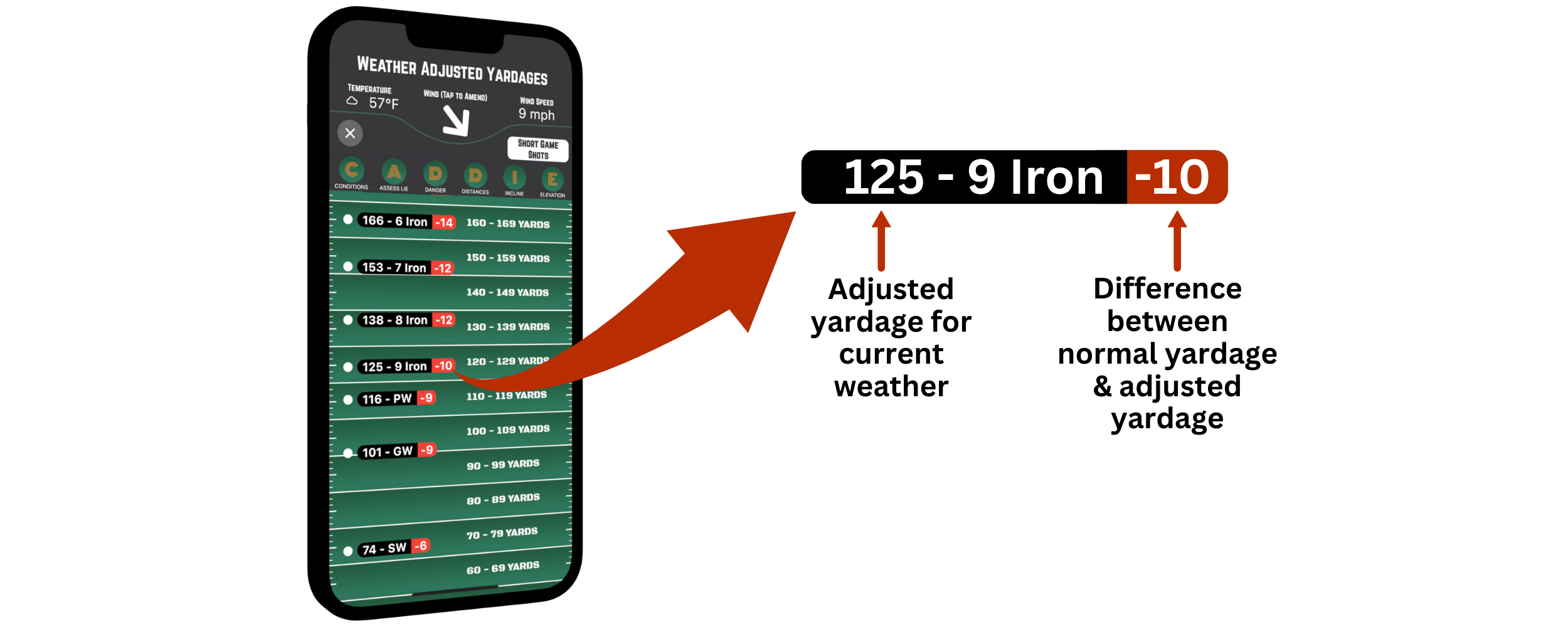 We know that weather conditions has a huge effect on your yardages, so we created this real time screen that instantly adjusts your distances as you move around the course.